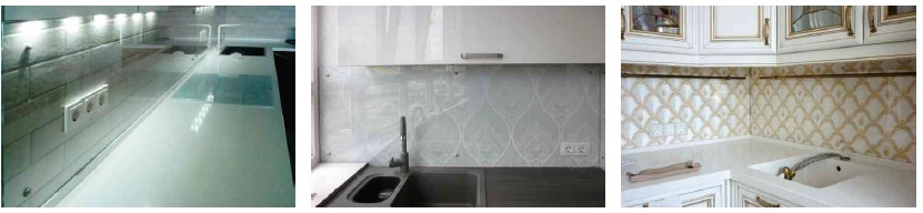 Скинали из ПРОЗРАЧНОГО ОСВЕТЛЕННОГО закаленного стекла толщиной 6 мм с традиционным сквозным крепежом. Применение осветленного стекла целесообразно в тех случаях, когда панель монтируется на светлую поверхность или гарнитур имеет былые фасады.