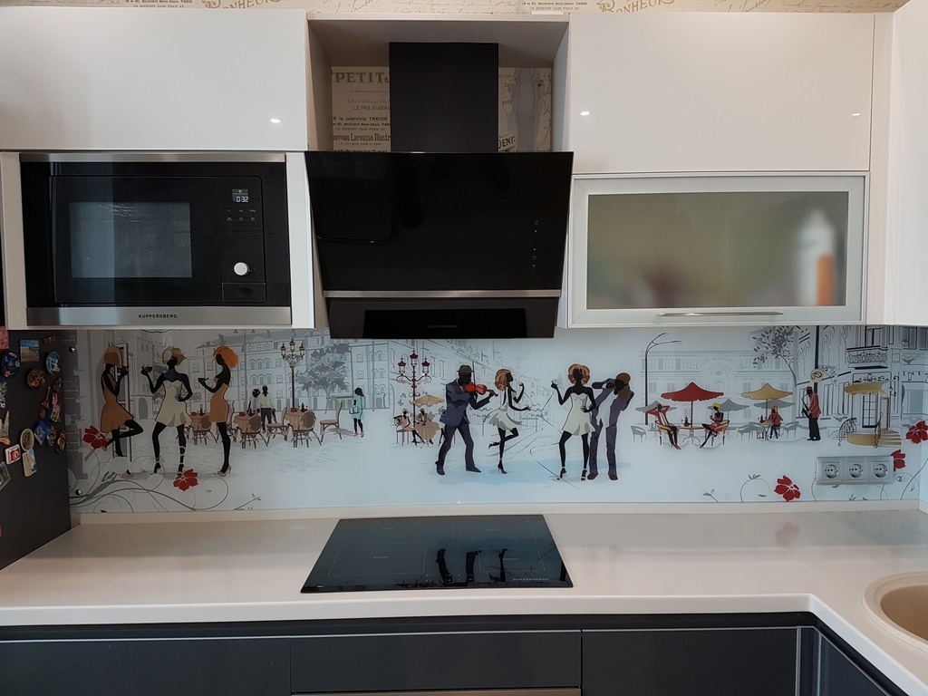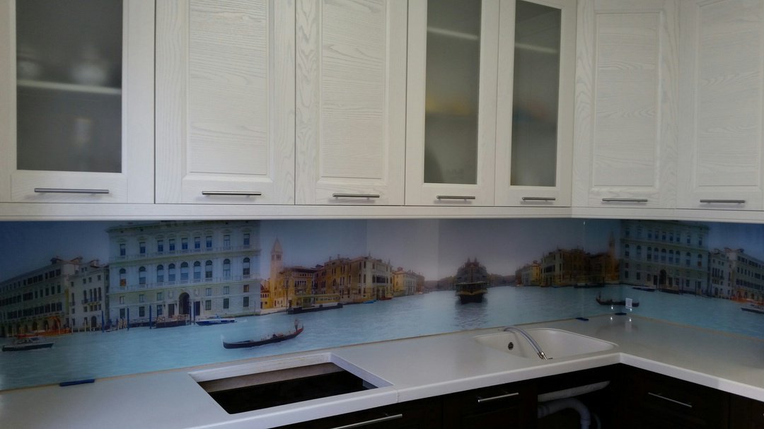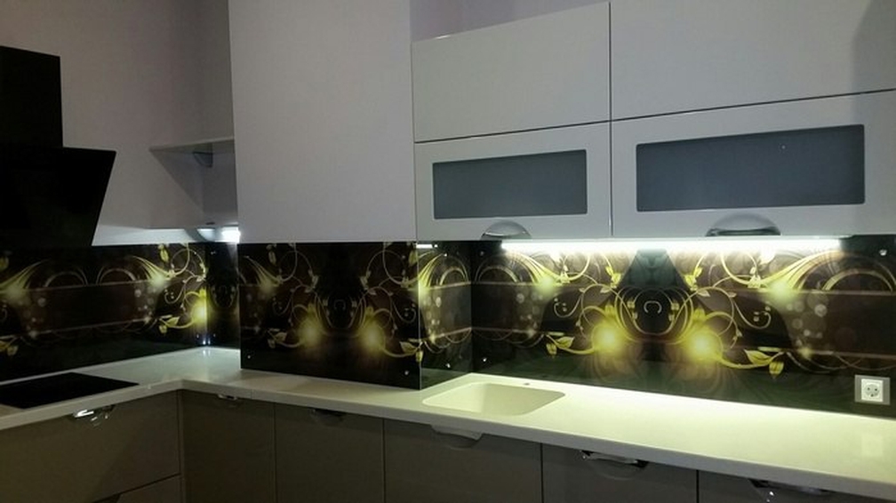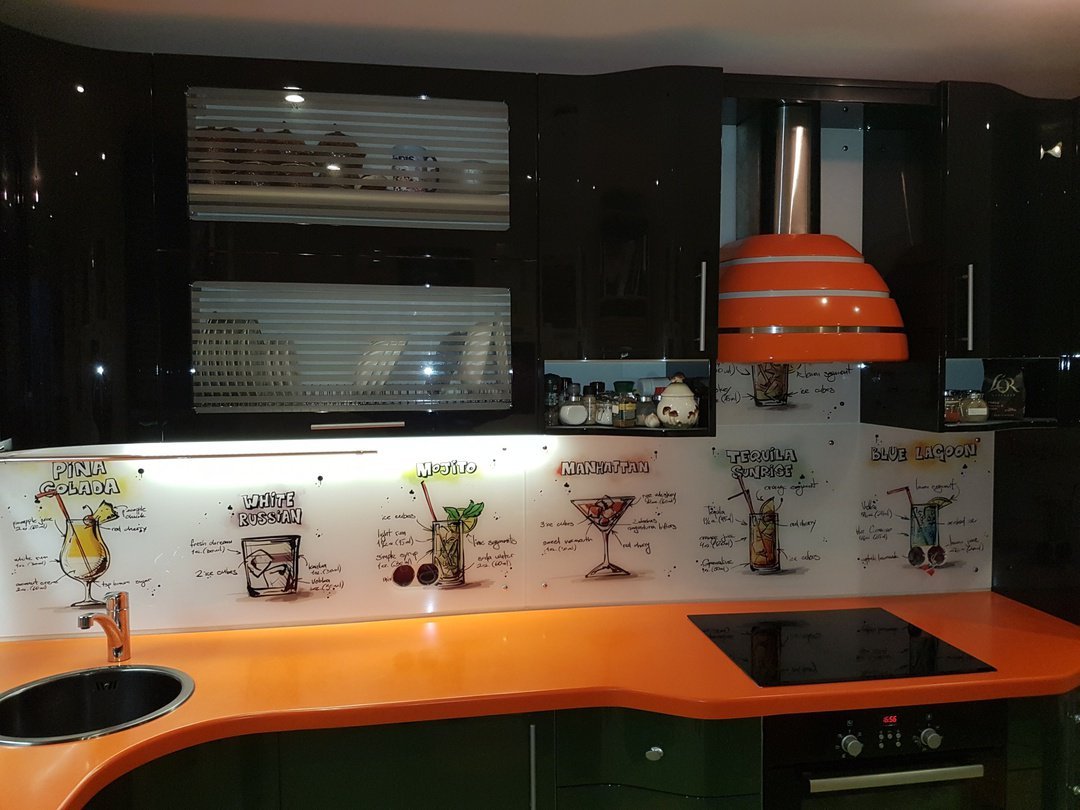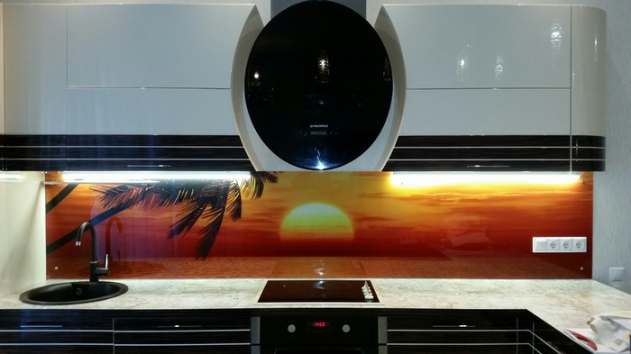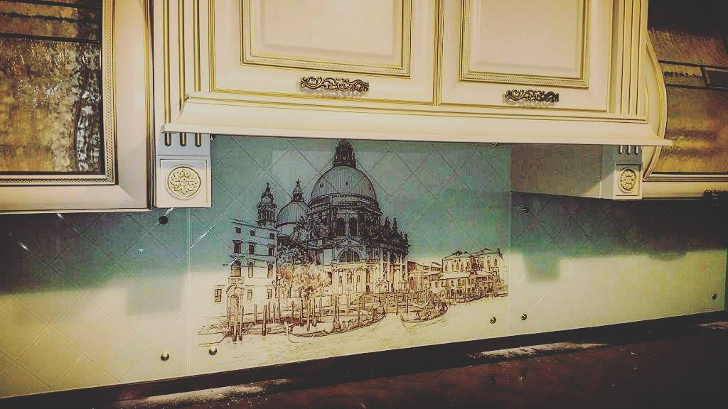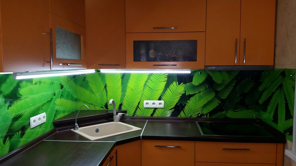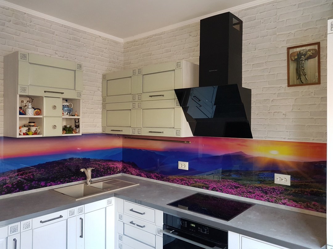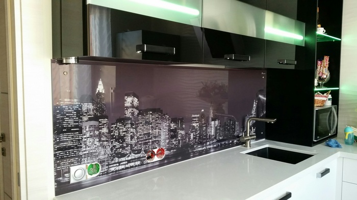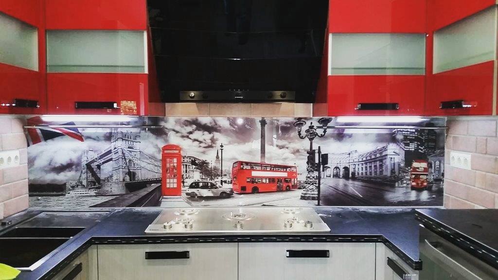 Но, это не главная особенность стеклянных панелей – главная особенность заключается в том, что UV-печать позволяет качественно нанести практически любое изображение, будь то фотография природы, города, лесной пейзаж, или просто набор орнаментов или схематичных изображений. Эта возможность делает скинали отличным элементом дизайна (дизайнер может изобразить на стеклянной поверхности практически все что угодно). Поэтому стеклянные фартуки являются превосходным украшением вашей кухни.