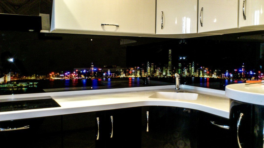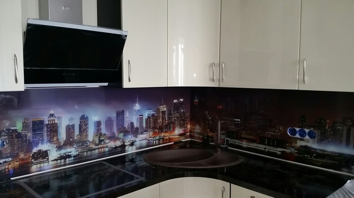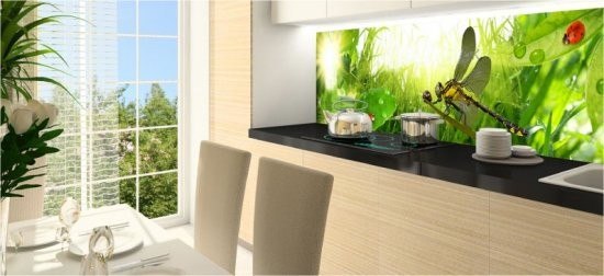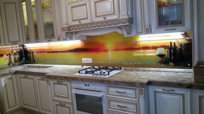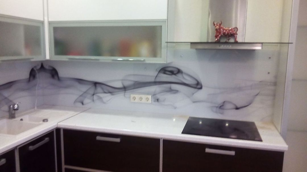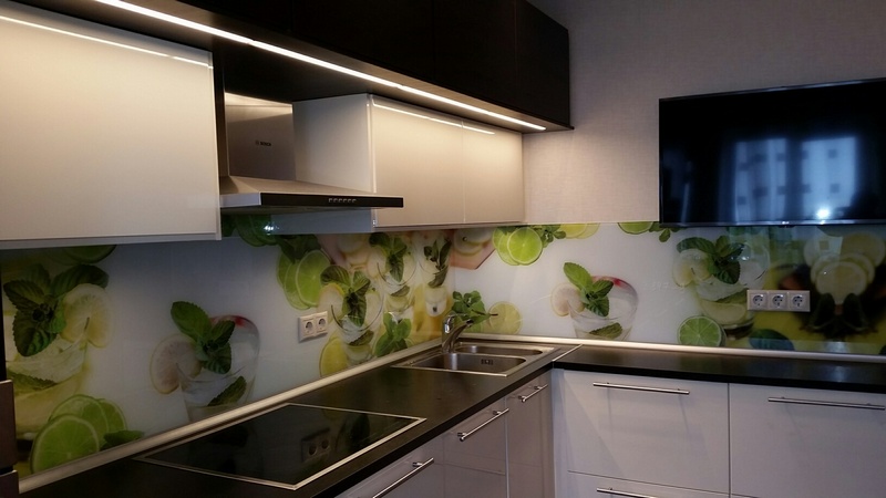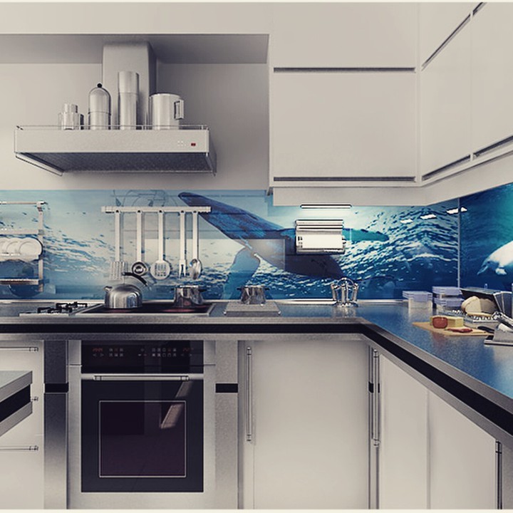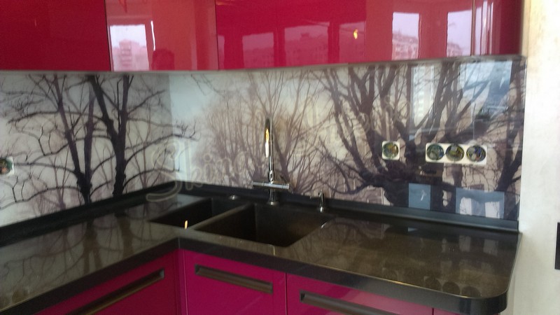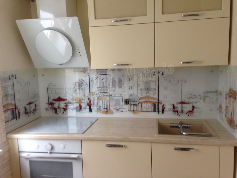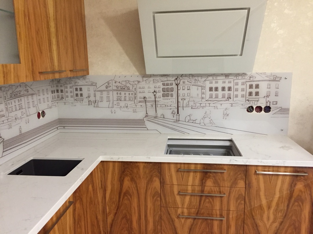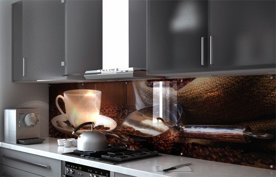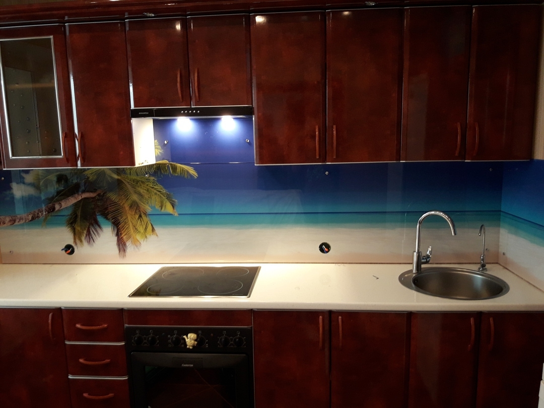 Но, это не главная особенность стеклянных панелей – главная особенность заключается в том, что UV-печать позволяет качественно нанести практически любое изображение, будь то фотография природы, города, лесной пейзаж, или просто набор орнаментов или схематичных изображений. Эта возможность делает скинали отличным элементом дизайна (дизайнер может изобразить на стеклянной поверхности практически все что угодно). Поэтому стеклянные фартуки являются превосходным украшением вашей кухни.