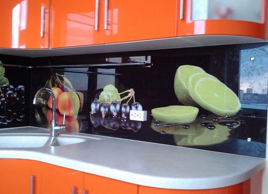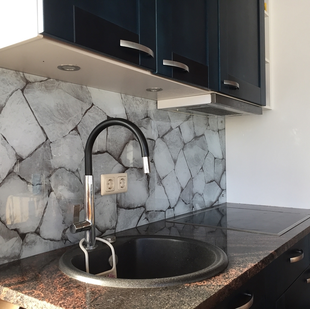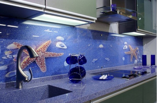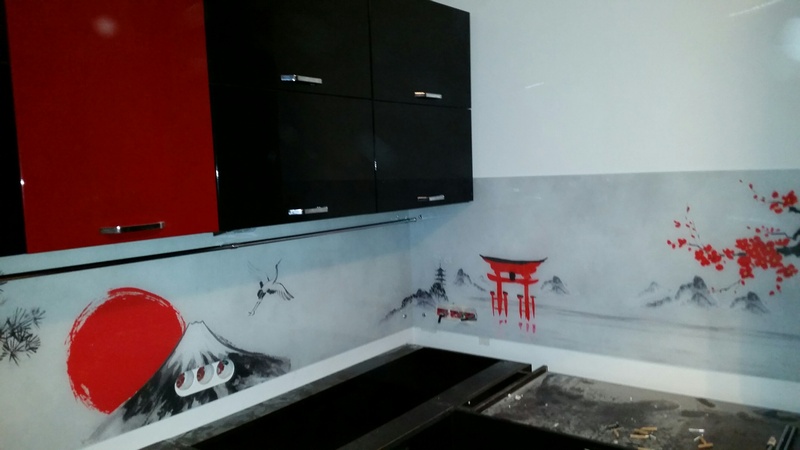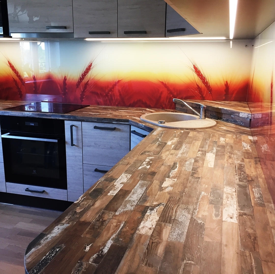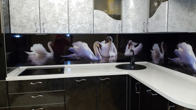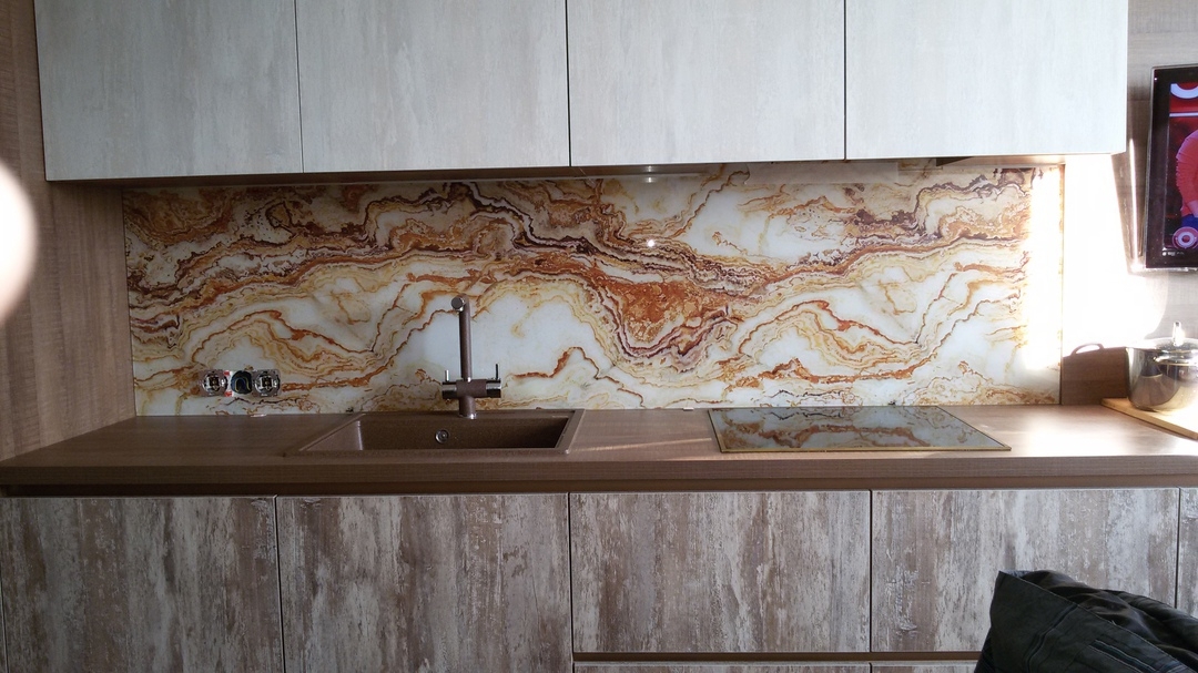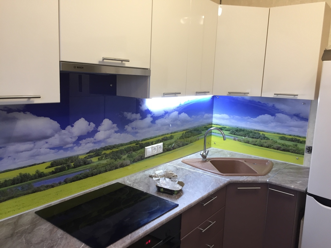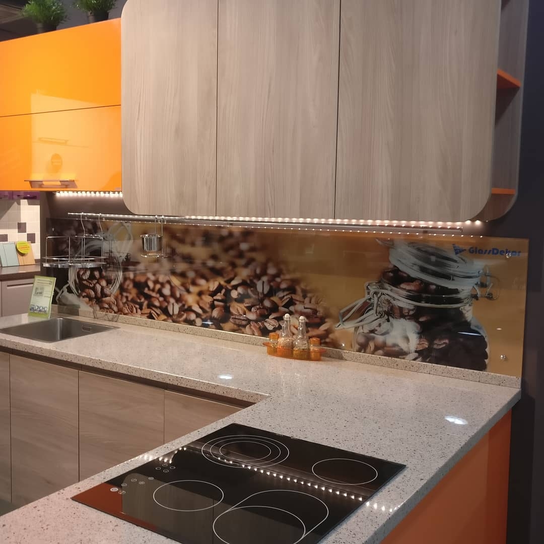 Но, это не главная особенность стеклянных панелей – главная особенность заключается в том, что UV-печать позволяет качественно нанести практически любое изображение, будь то фотография природы, города, лесной пейзаж, или просто набор орнаментов или схематичных изображений. Эта возможность делает скинали отличным элементом дизайна (дизайнер может изобразить на стеклянной поверхности практически все что угодно). Поэтому стеклянные фартуки являются превосходным украшением вашей кухни.