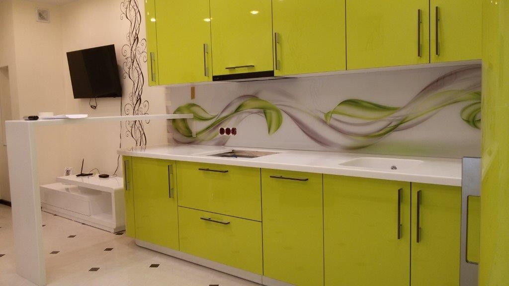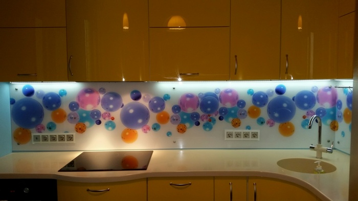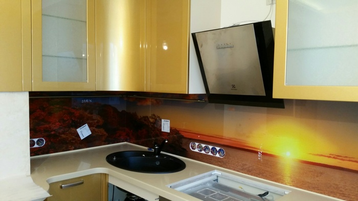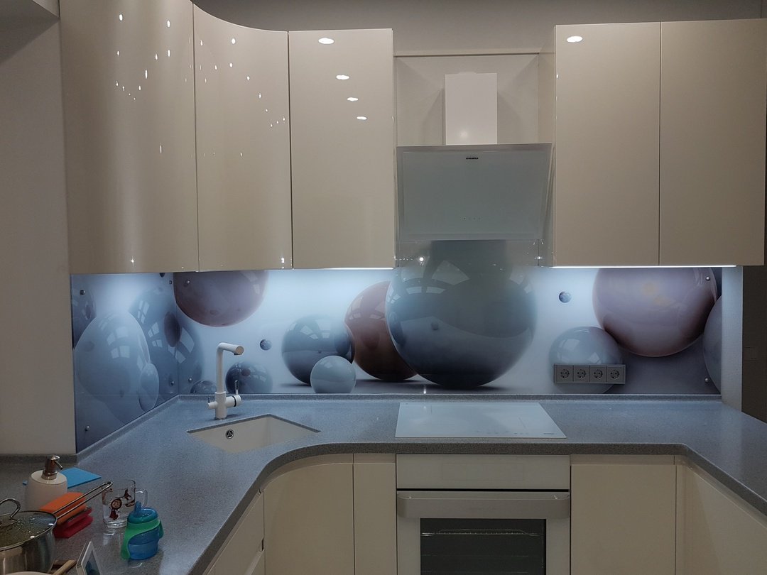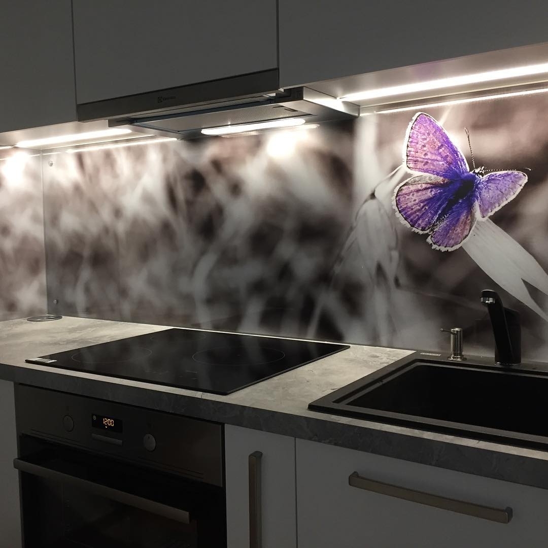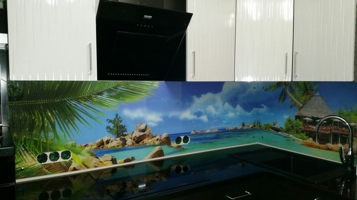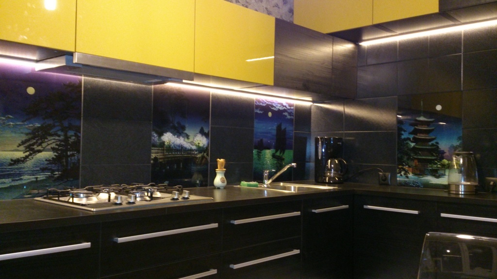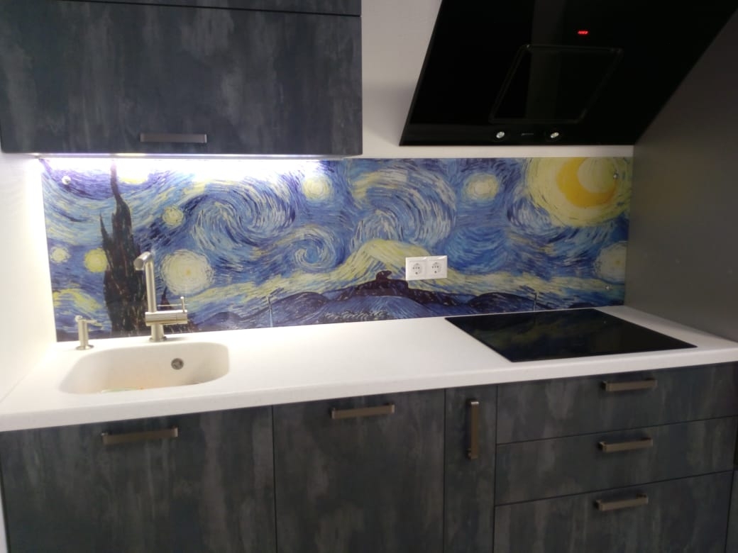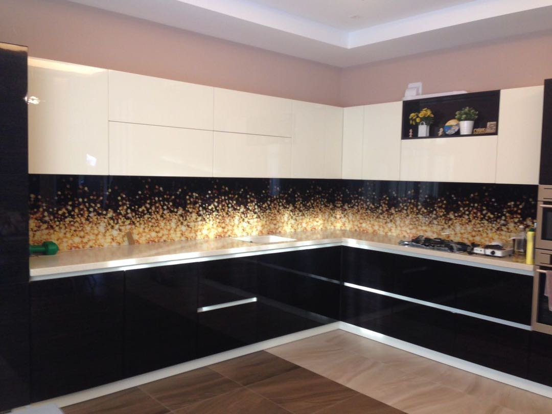 Но, это не главная особенность стеклянных панелей – главная особенность заключается в том, что UV-печать позволяет качественно нанести практически любое изображение, будь то фотография природы, города, лесной пейзаж, или просто набор орнаментов или схематичных изображений. Эта возможность делает скинали отличным элементом дизайна (дизайнер может изобразить на стеклянной поверхности практически все что угодно). Поэтому стеклянные фартуки являются превосходным украшением вашей кухни.