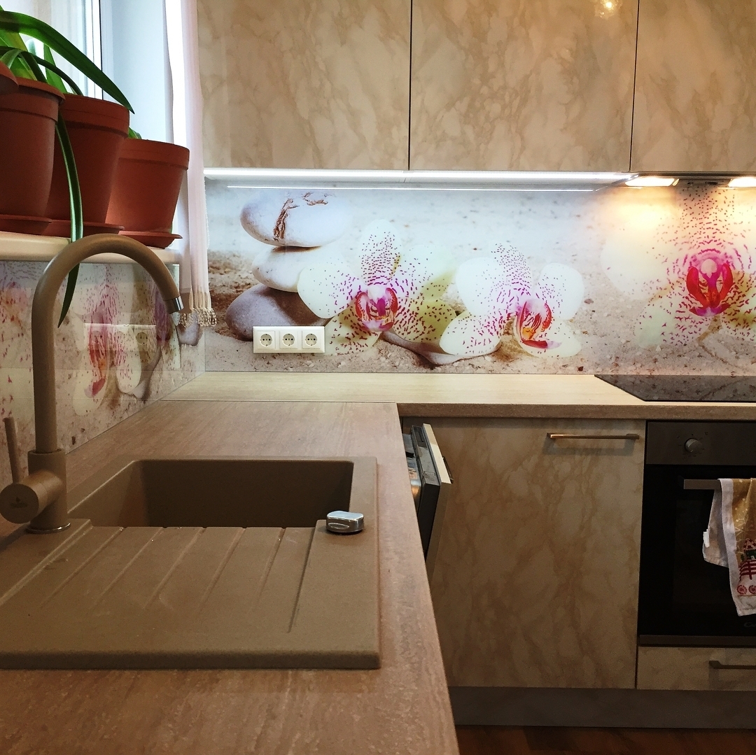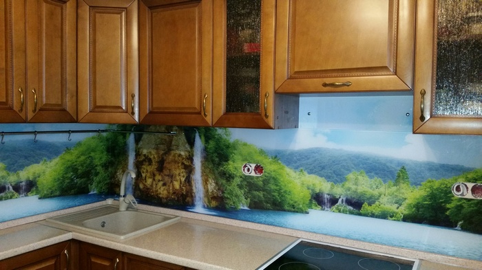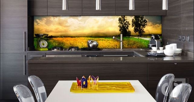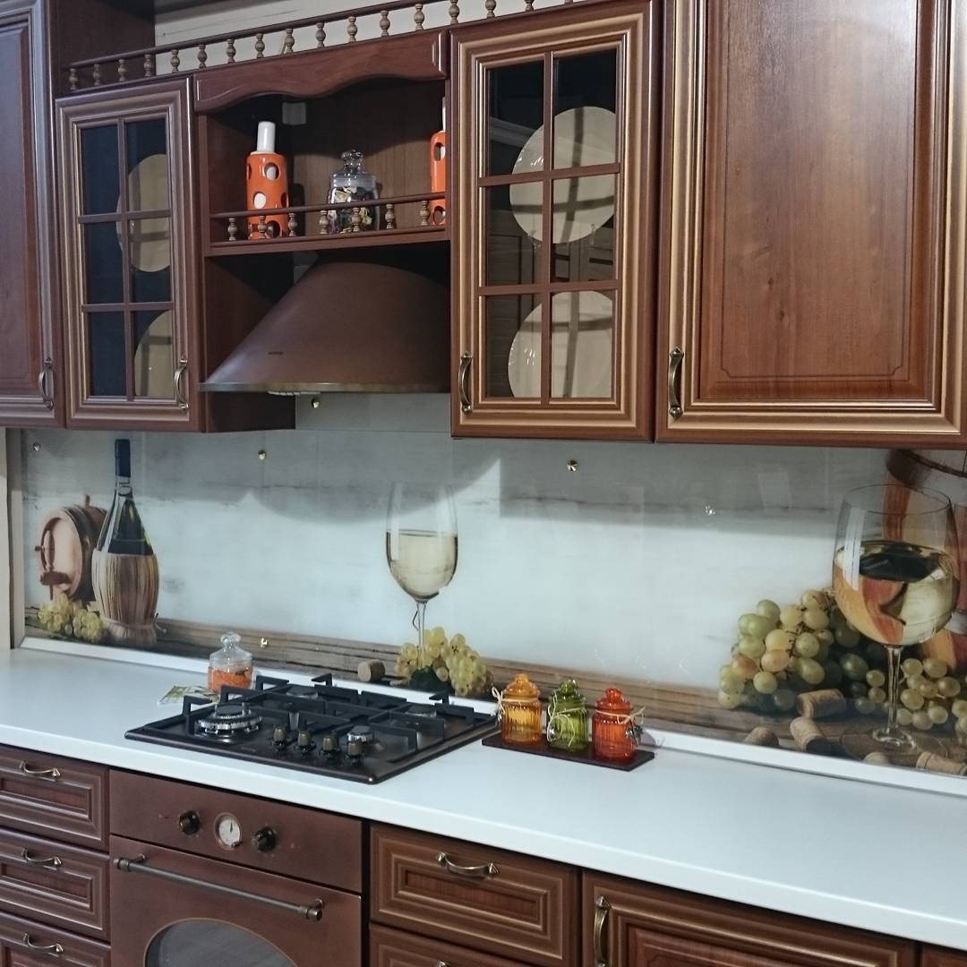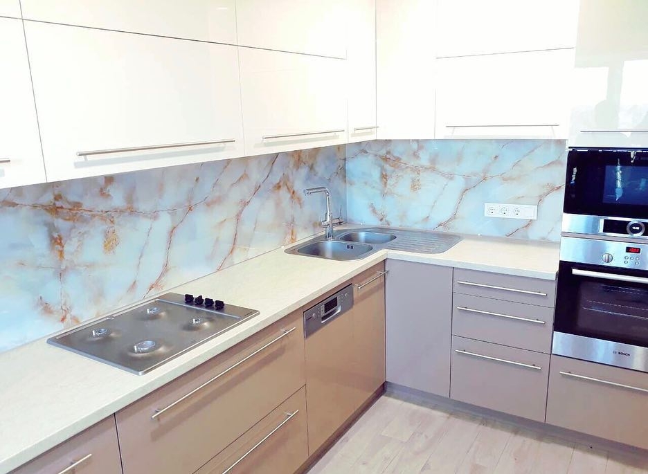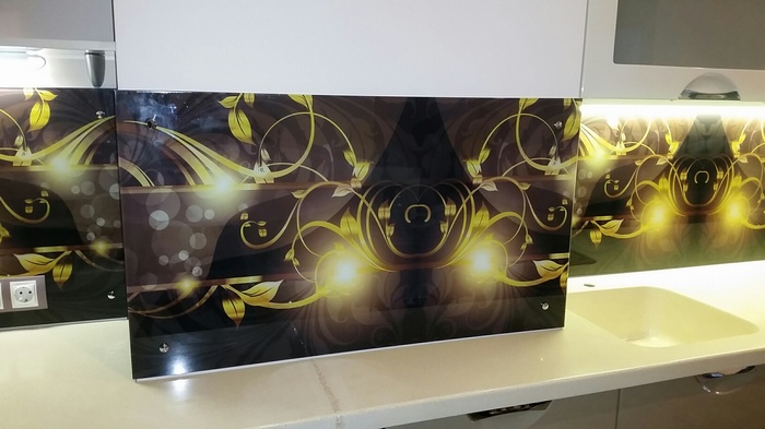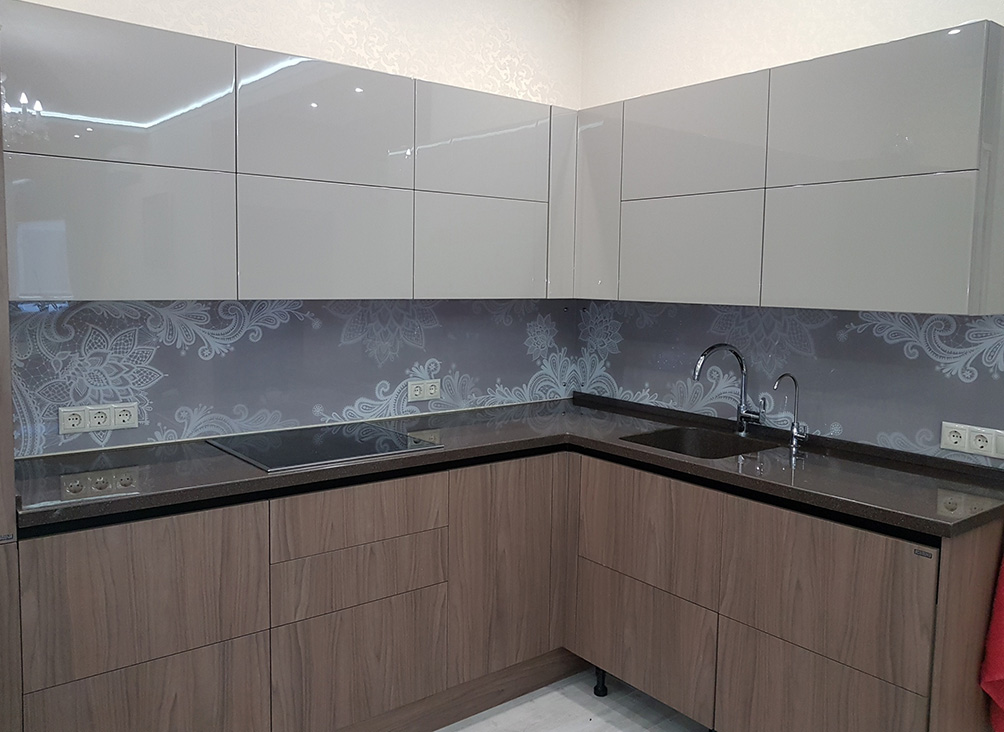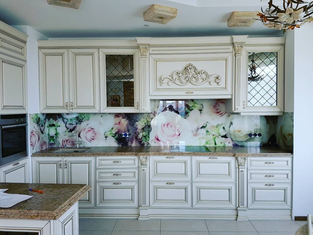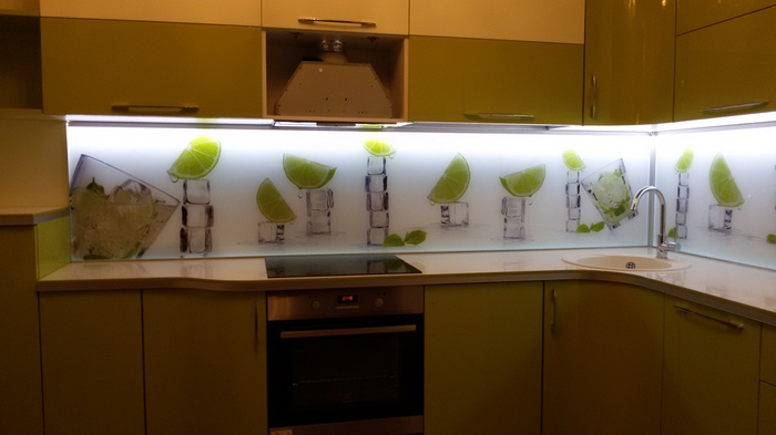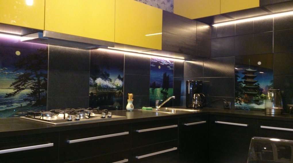 Но, это не главная особенность стеклянных панелей – главная особенность заключается в том, что UV-печать позволяет качественно нанести практически любое изображение, будь то фотография природы, города, лесной пейзаж, или просто набор орнаментов или схематичных изображений. Эта возможность делает скинали отличным элементом дизайна (дизайнер может изобразить на стеклянной поверхности практически все что угодно). Поэтому стеклянные фартуки являются превосходным украшением вашей кухни.