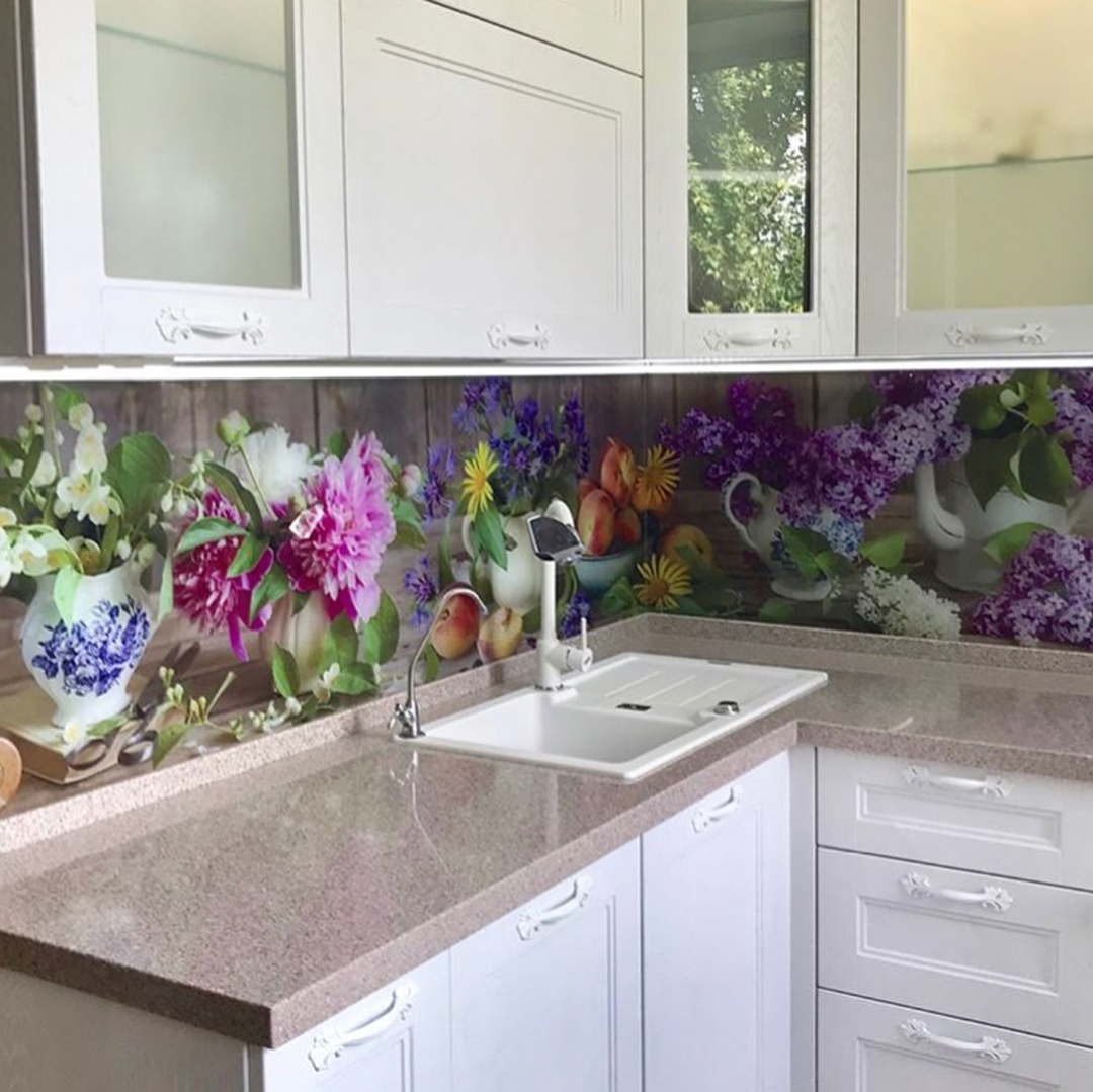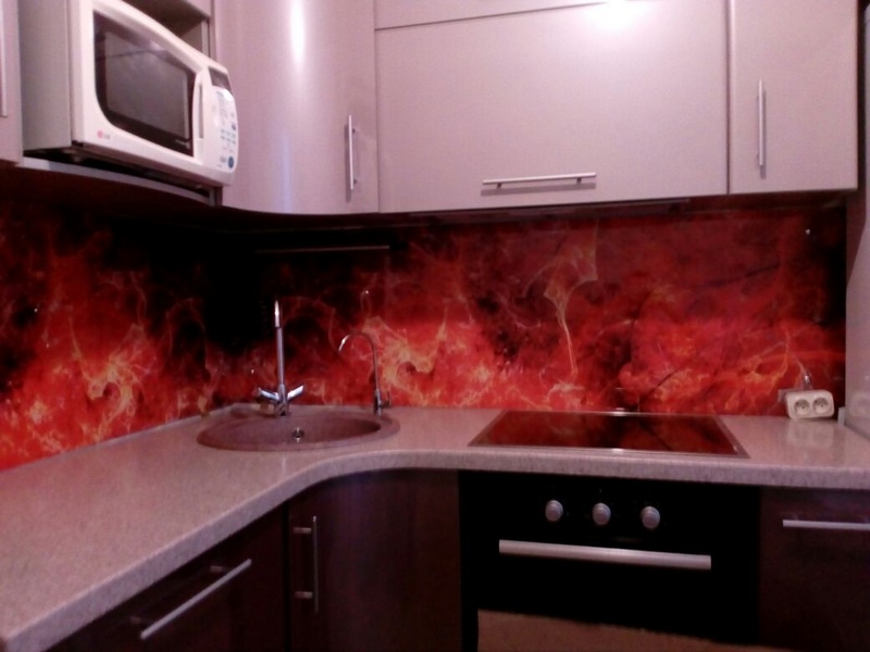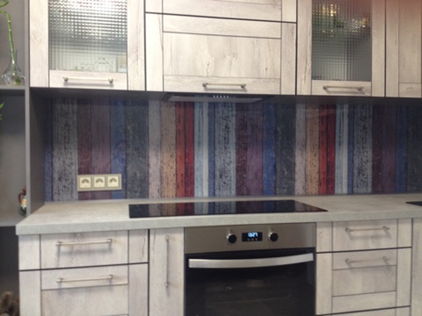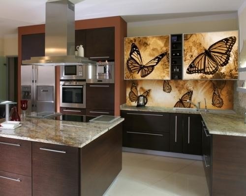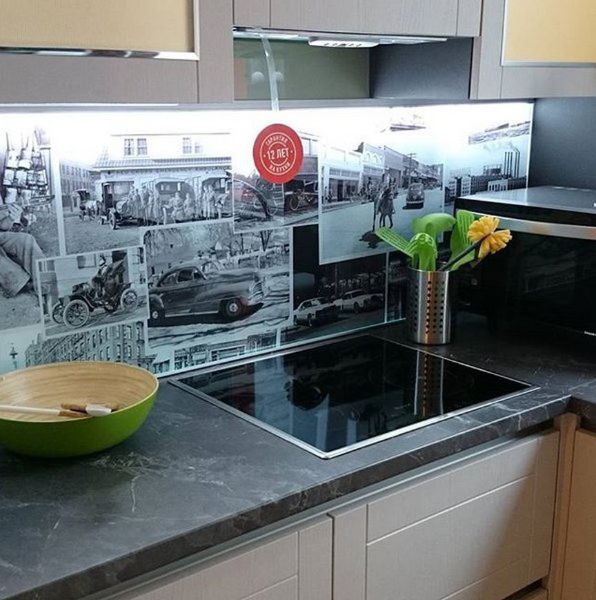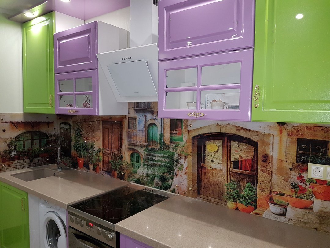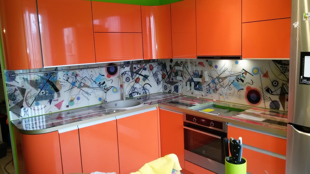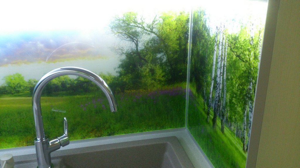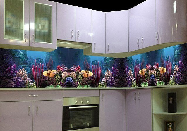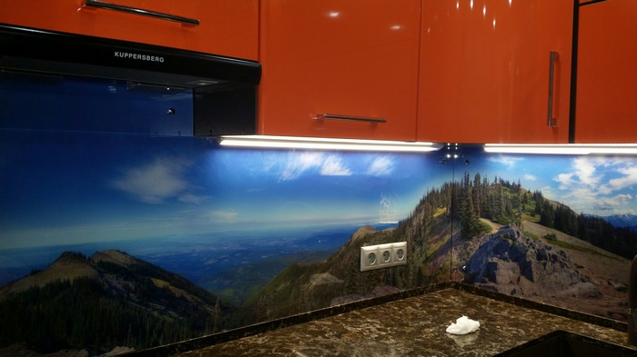 Но, это не главная особенность стеклянных панелей – главная особенность заключается в том, что UV-печать позволяет качественно нанести практически любое изображение, будь то фотография природы, города, лесной пейзаж, или просто набор орнаментов или схематичных изображений. Эта возможность делает скинали отличным элементом дизайна (дизайнер может изобразить на стеклянной поверхности практически все что угодно). Поэтому стеклянные фартуки являются превосходным украшением вашей кухни.